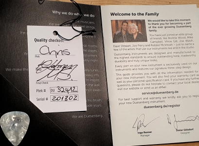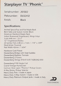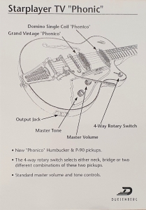 Starplayer Phonic ist ein semi-akustisches Instrument mit massiven Mittelblock, elegantem Pearloid-Binding, einem F-Loch, gewölbter Decke/ flachem Boden, D-typische massive Hardware in Gold, GrandVintage Humbucker und Domino P90 in vergoldeten Phonico Kappen, 4-Wege Drehschalter, seidiges Spielgefühl, original Koffer, kaum gespielt