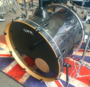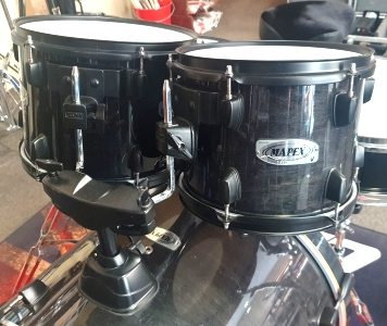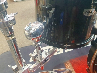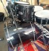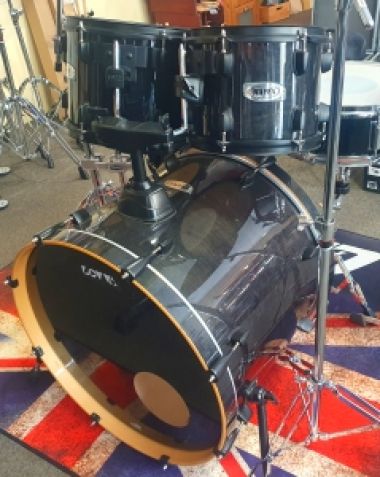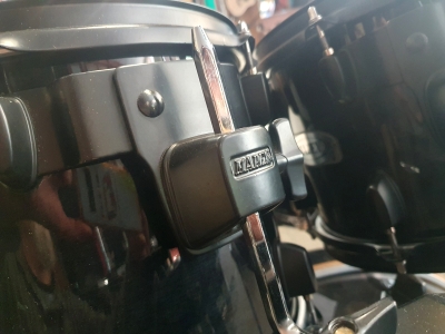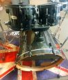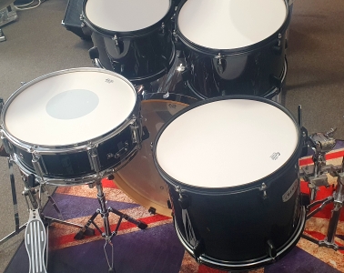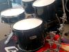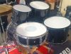 Fusion-Set: 22"x18"BD/ 14"x4,5"SN Wood/ 10"+12"+14" Toms, gedämpfte Tomaufhängungen, Kessel aus 9 Lagen Amerik. Linde(Basswood), Hardware black, Kugelgelenk- Tomhalter, inkl. 2 Beckenständer/ Snarestand/ Hihatstannd/ BD Pedal, Felle neu (coated), ohne Becken!, optisch leichte Kratzer, super spielbar
