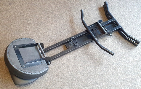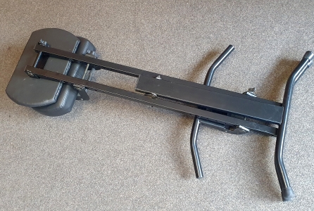 stabiler Musikersitz aus Stahl, mit Lehne, klappbare breite Fußablage, Sitzhöhe zw. 65 u. 80 cm einstellbar, Sitz u. Lehne gepolstert, flach zusammenlegbar, sehr guter Zustand