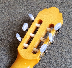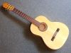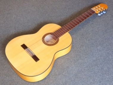 massive Fichtendecke, flachere Zarge als Konzertgitarre, Ahornhals- u. Kopfplatte, brünierte Mechaniken, voller & lauter Sound, Kleberreste um den Steg herum, sonst sehr guter Zustand