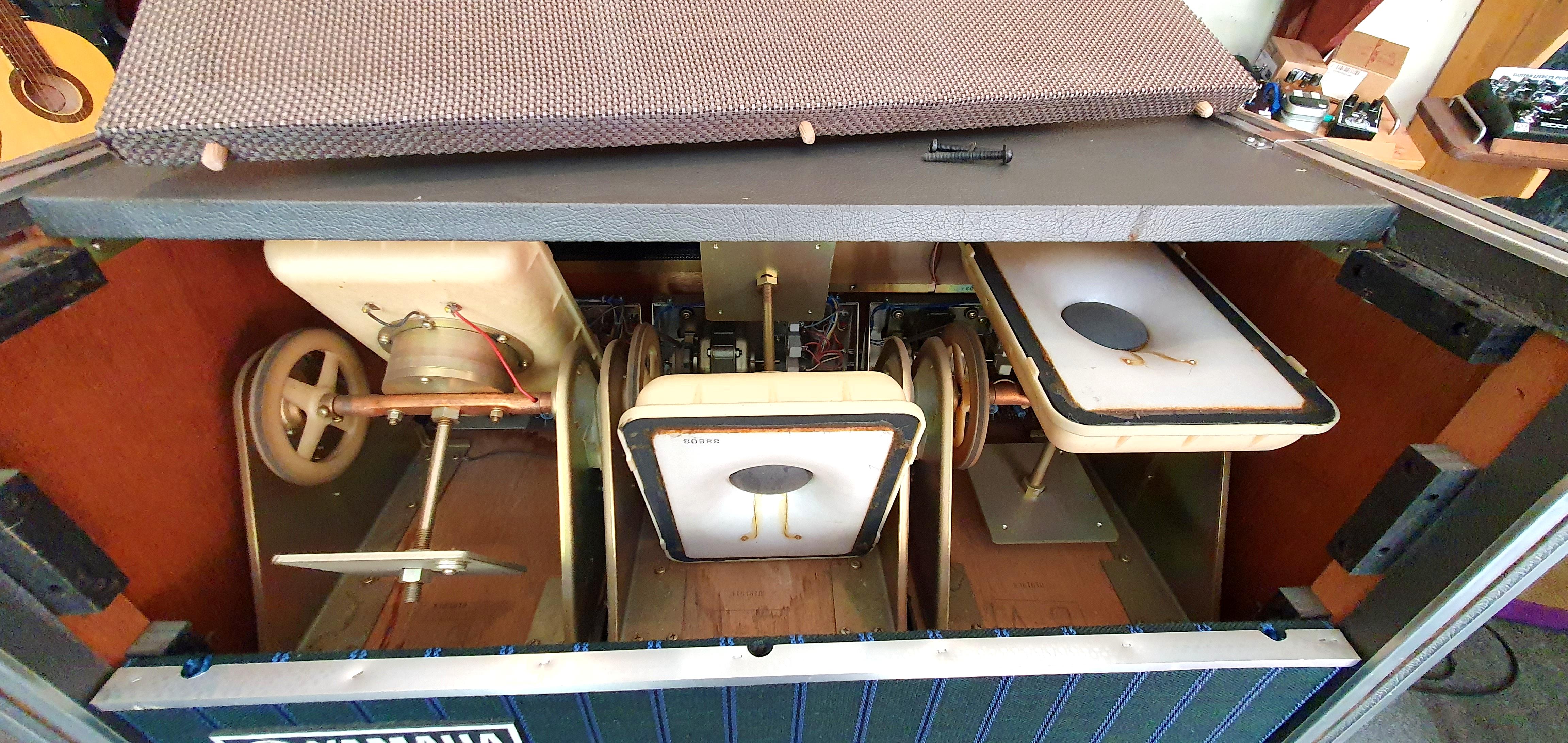 eine spezielle Bauart aus der Ära "Rotationsboxen" bzw. Leslie Kabinette der 70er Jahre, 200W Transistoramp, Regler: Volume/ Bass/ Treble/ Reverb/ Tremolo Speed, Anschlüsse: Remote/ Input Lo/ Hi/ externer Speaker, 3 bewegliche 4" Hochtöner + 4 feste 12" Speaker, Fußschalter schaltet Hochtöner zu/ ab, sehr guter Zustand
